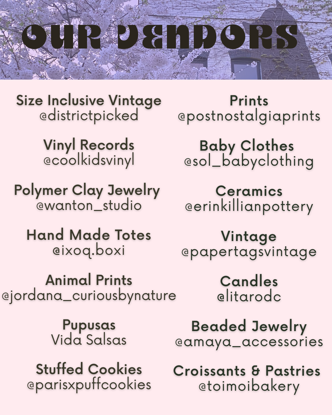Explore unique gifts, delicious treats, and more from over 25 vendors. Including hand made totes, curated unisex vintage, ceramics, soy candles, body and hair care, artisan chocolate, jewelry, spring and nature prints and more!